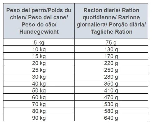 frango fresco (40%), coelho seco (20%), pato seco (10%), abóbora, grão de bico, ervilha, gordura de frango (conservada com tocoferóis, 5%), fígado de galinha (3%), óleo de salmão (2%), maçãs, cenouras, linhaça, cascas de crustáceos hidrolisados (fonte de glucosamina, 0,026%), extrato de cartilagem (fonte de condroitina, 0,016%), levedura de cerveja (fonte de manano-oligossacarídeos, 0,015%), raiz de chicória (fonte de fruto-oligossacarídeos, 0,01%), Yucca schidigera (0,01%), algas (0,01%), psyllium (0,01%), tomilho (0,01%), alecrim (0,01%), orégano (0,01%), cranberries (0,0008%), mirtilos (0,0008%), espinheiro (0,0008%), raiz de gengibre (0,0008%), sálvia (0,0008%)