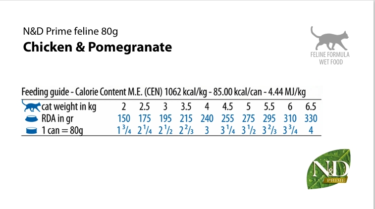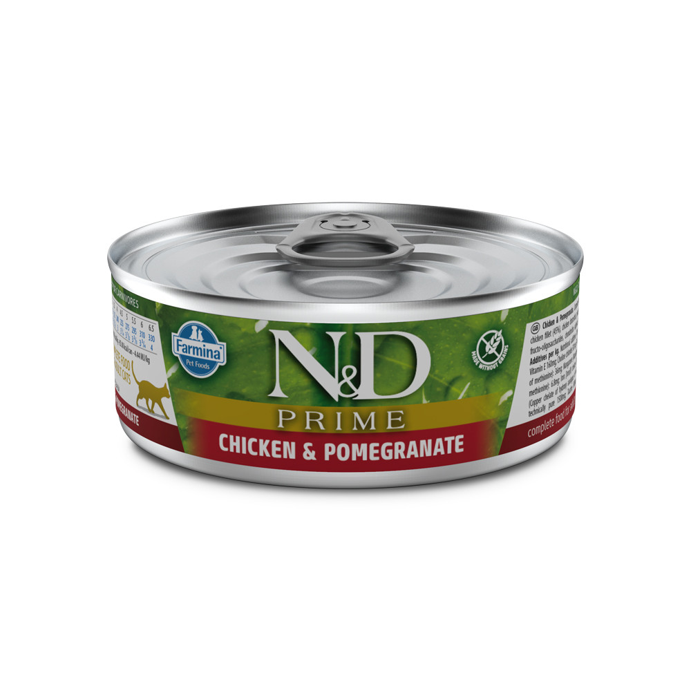 Farmina N&D Prime Chicken & Pormegranate é um alimento húmido completo para gatos, formulado com frango de origem italiana, criado ao ar livre, e romã. Cuidadosamente cozinhado a vapor e sem adição de conservantes artificiais.
