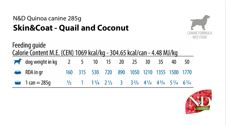 N&D Quinoa Skin & Coat é um alimento dietético completo para cães, indicado para redução de intolerâncias a ingredientes e nutrientes.
