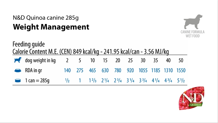 N&D Quinoa Weight Management é um alimento dietético completo para cães, indicado para a redução do execsso peso corporal.