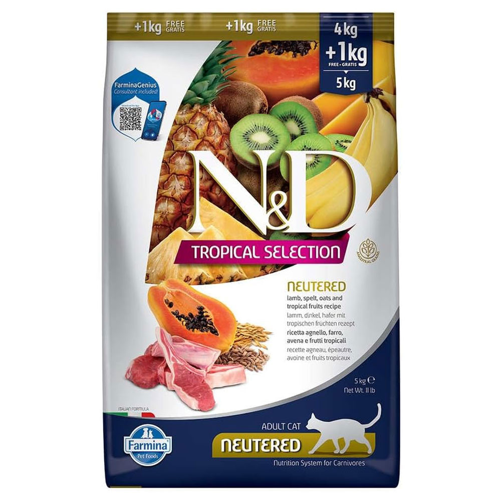 Farmina N&D Tropical Selection Neutered é um alimento seco completo para gatos esterilizados, com 90% de proteína de origem animal e sem conservantes artificiais nem milho. Formulado com cordeiro criado em pastagens, cereais, benéficos no controlo glicémico e frutas tropicais.