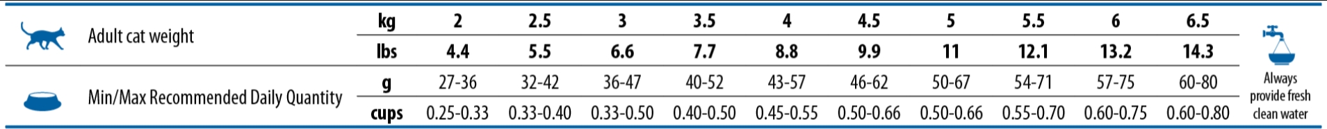proteína bruta 31,00%; gordura bruta 11,00%; fibra bruta 6,50%; humidade 8,00%; cinza bruta 8,50%; Cálcio 1,10%; Fósforo 0,90%; Magnésio 0,09%; ómega-6 2,00%; ómega-3 0,40%; DHA 0,15%; EPA 0,10%; Taurina 0,18%.