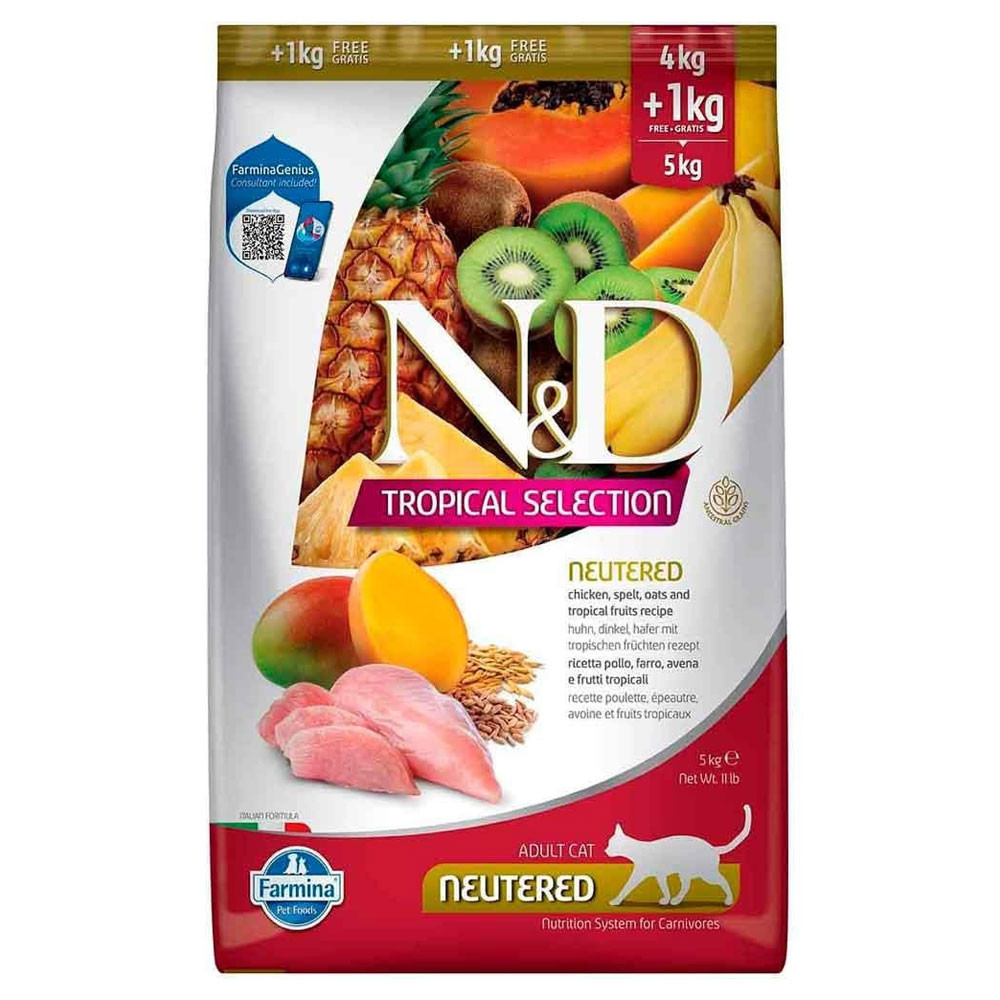 Farmina N&D Tropical Selection Neutered é um alimento seco completo para gatos esterilizados, com 90% de proteína de origem animal e sem conservantes artificiais nem milho. Formulado com frango criado ao ar livre, cereais, benéficos no controlo glicémico e frutas tropicais.