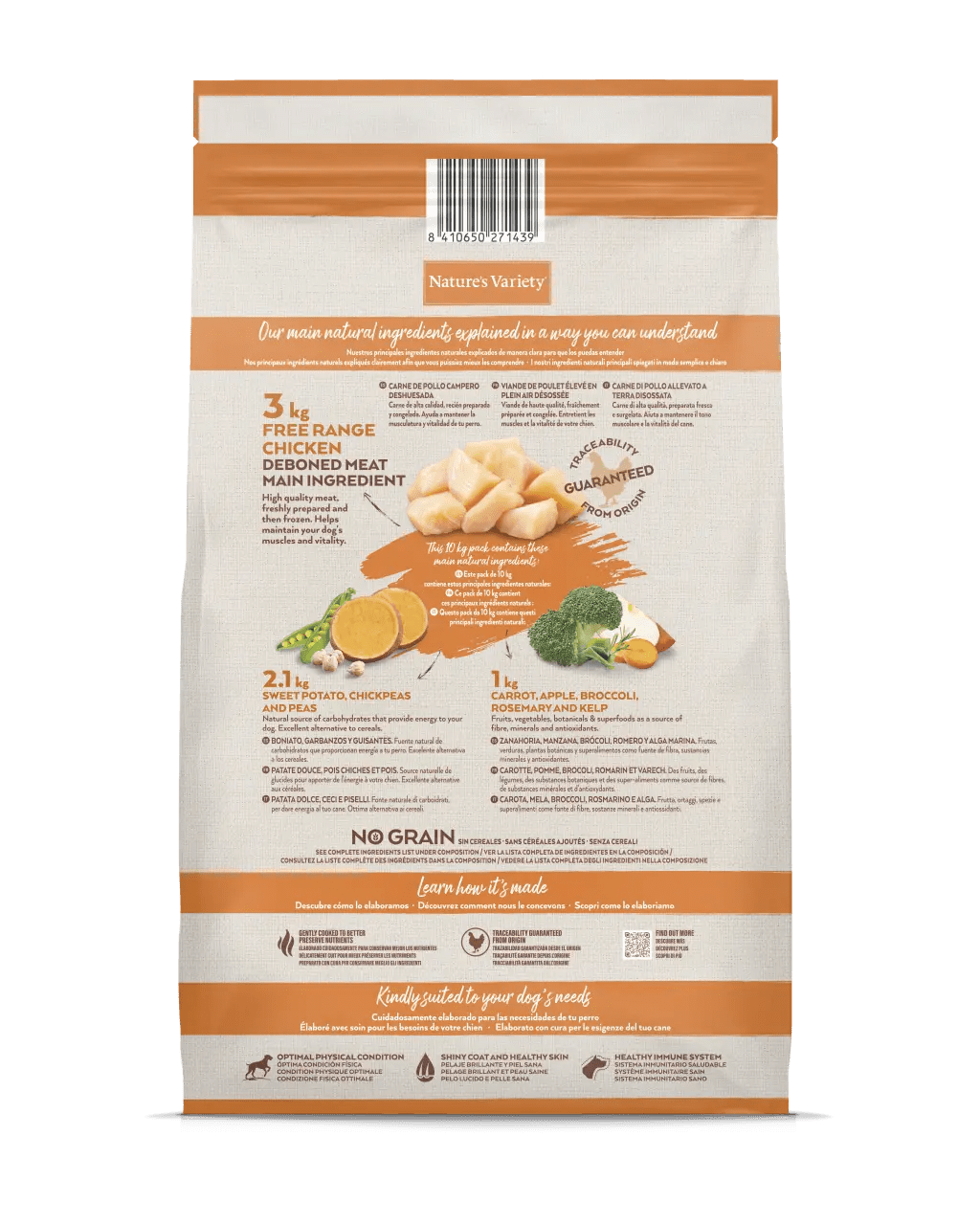 Carne de frango criado ao ar livre desossada* (30%), proteína desidratada de frango (22%), ervilhas desidratadas* (12%), grão de bico desidratado* (5,5%), amido de ervilha*, gordura de aves* (5%), batata doce desidratada* (4%), hidrolisado de proteína (3,5%), fécula de batata*, fibra de ervilha*, raiz de chicória desidratada*, substâncias minerais, cenoura desidratada* (0,5%, equivalente a 4% de cenoura fresca), brócolos desidratados* (0,5%, equivalente a 4% de brócolos frescos), maçã desidratada* (0,3%, equivalente a 2% de maçã fresca), alga desidratada* (0,01%), alecrim desidratado* (0,01%).,