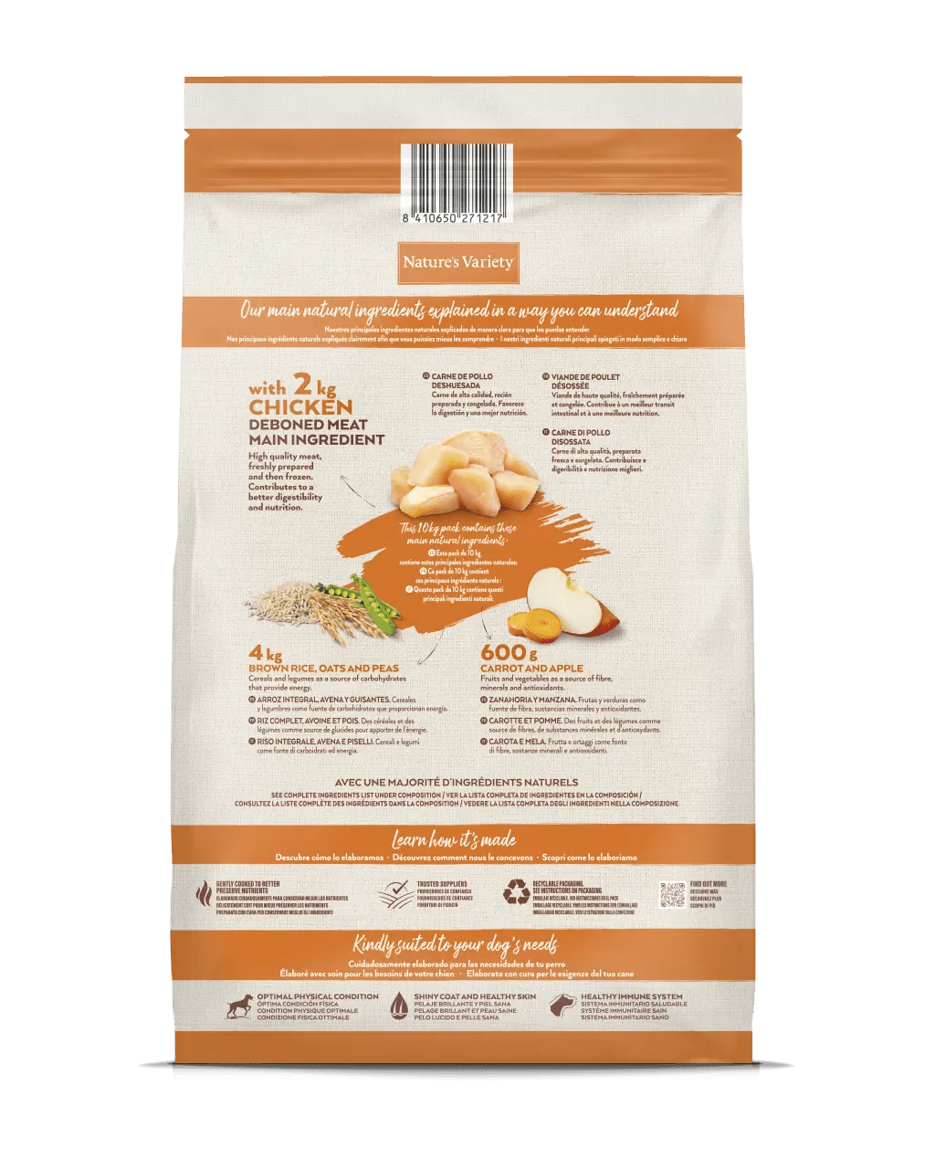 Elaborado com carne de frango desossada como ingrediente principal. Complementado com frutas e legumes cuidadosamente selecionados e cereais integrais.