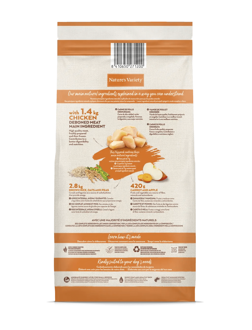 Nature´s Variety Original Mini com Frango e cereais integrais é um alimento seco, elaborado com carne de frango desossada como ingrediente principal, frutas e legumes cuidadosamente selecionados e cereais integrais. Para cães adultos de raças pequenas, até aos 10 Kg.