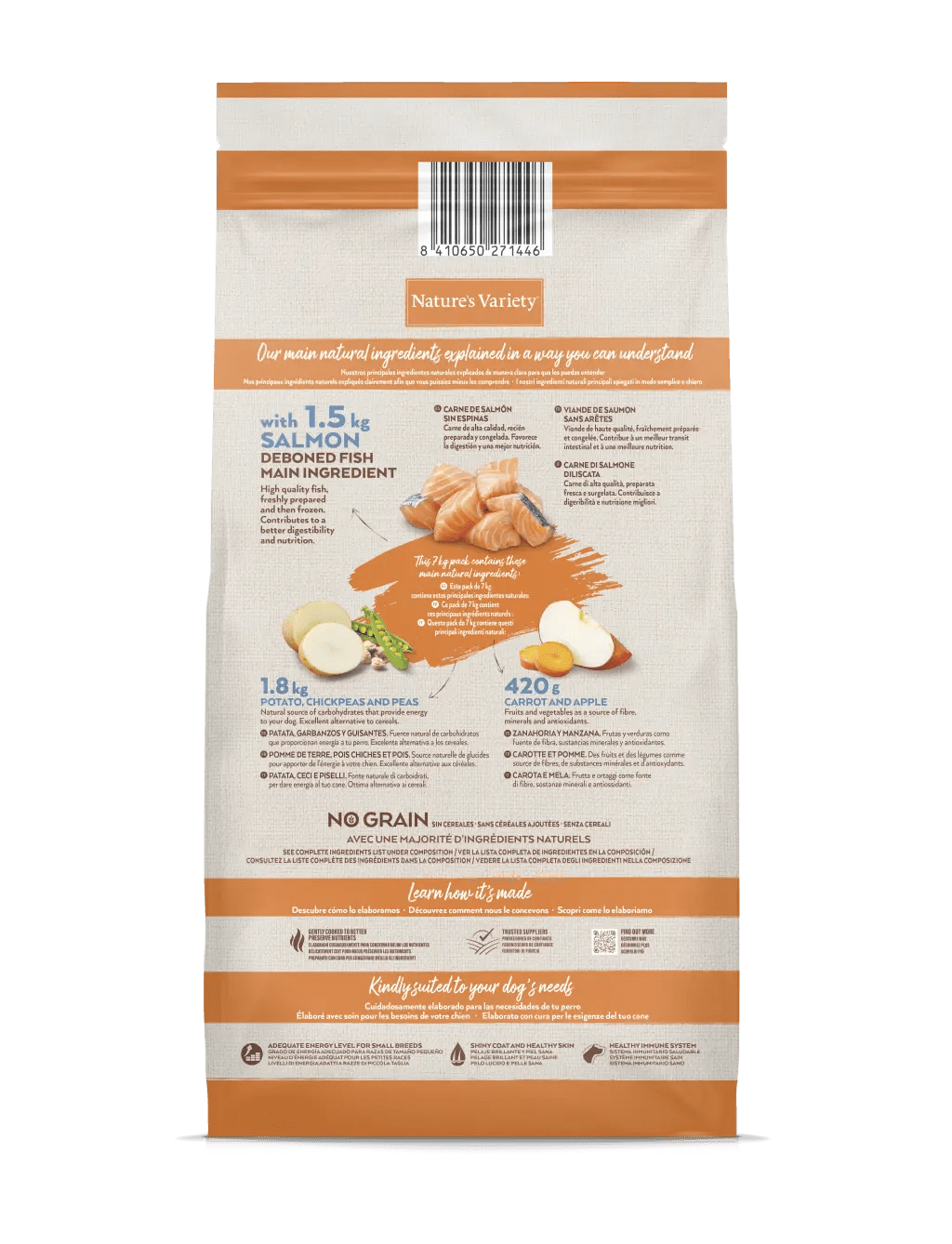 Carne de salmao sem espinhas* (21%), proteina desidratada de atum (20%), ervilhas desidratadas* (12%), amido de ervilha*, batata desidratada* (8%), gordura de aves de capoeira* (7%), grao-de-bico desidratado* (6%), hidrolisado de proteina (4%), fibra de ervilha*, proteina de batata, raiz de chicoria desidratada*, cenoura desidratada* (0,5%, equivalente a 4% de cenoura fresca), maca desidratada* (0,3%, equivalente a 2% de maca fresca), substancias minerais.
