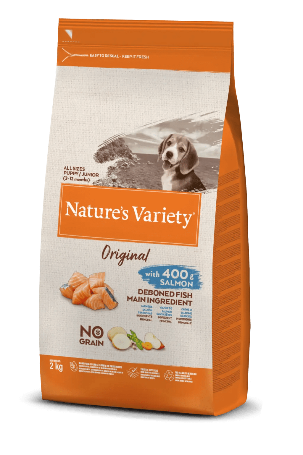 Nature's Variety Original No Grain Junior salmão é um alimento seco, sem cereais, para cachorros, elaborado com salmão sem espinhas como ingrediente principal, frutas e legumes cuidadosamente selecionados, e fontes naturais de hidratos de carbono alternativos. Contém batata-doce, ervilhas e grão-de-bico como fontes de hidratos de carbono. Além disso, inclui vários tipos de fruta e legumes para assegurar um fornecimento ótimo de substâncias vitais.