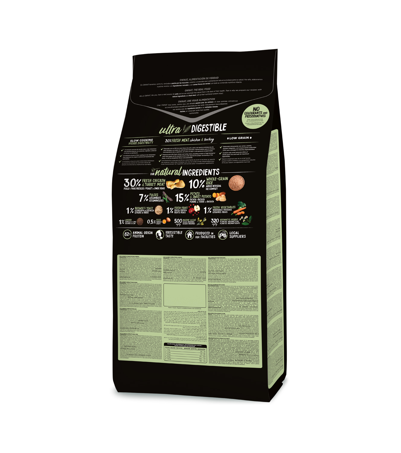 Ownat Ultra proporciona uma nutrição ótima e da máxima qualidade. Contém 30% de carne fresca de frango e de peru e 17% de carne desidratada. A carne vem acompanhada de batata, ervilhas, cenoura, brócolos, ovos, algas marinhas, maçãs, mirtilos e plantas aromáticas. Utiliza, apenas e em uma pequena porção, cereais integrais como o arroz e a cevada, excluindo o milho, o trigo e a soja.