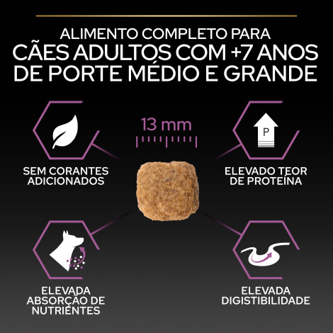 Purina® PRO PLAN® Dog Medium & Large Adult 7+ é um alimento completo para cães de tamanho médio e grande que melhora a função cerebral.