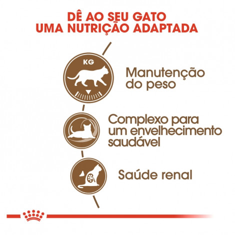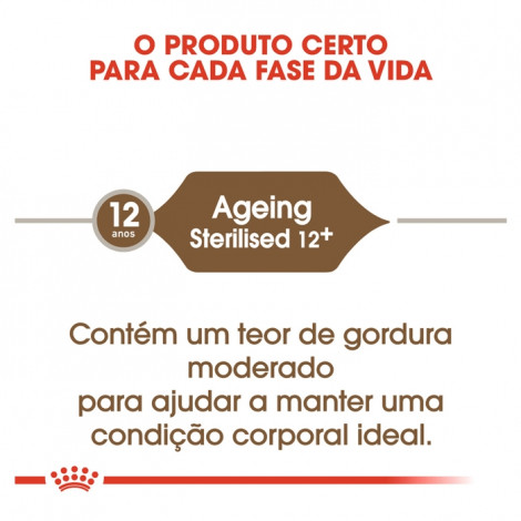 O ROYAL CANIN® Ageing Sterilised 12+ foi especificamente formulado tendo em conta as necessidades nutricionais específicas do seu gato sénior esterilizado. O ROYAL CANIN® Ageing Sterilised 12+ contém um teor moderado de gordura para ajudar o seu gato a manter um peso saudável.