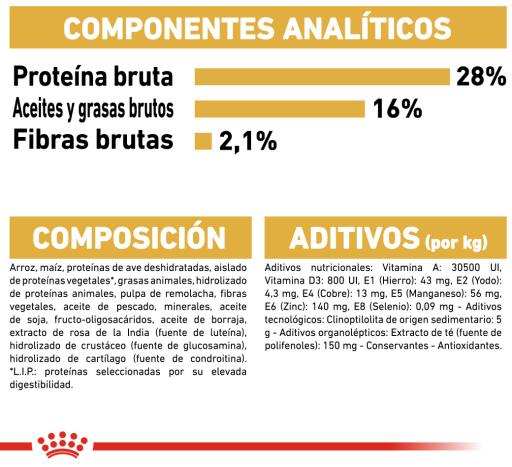 Arroz, milho, carne de aves desidratada, isolado de proteínas vegetais, gordura animal, hidrolisado de proteínas animais, polpa de beterraba, fibras vegetais, sais minerais, óleos vegetais (soja, borragem), óleo de peixe, fruto- oligossacarídeos, polifosfato de sódio, taurina, DL-metionina, L-tirosina, hidrolisado de crustáceos (fonte de glucosamina), extractos de chá verde e de uvas (fontes de polifenóis), L-carnitina, extracto de Flor de Tagete (fonte de luteína), hidrolisado de cartilagens (fonte de condroitina).