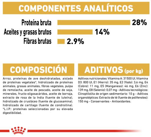 Arroz, carne de aves desidratada, isolado de proteínas vegetais, gordura animal, hidrolisado de proteínas animais, fibras vegetais, polpa de beterraba, sais minerais, óleos vegetais (soja, borragem), óleo de peixe, fruto-oligossacarídeos, polifosfato de sódio, taurina, hidrolisado de crustáceos (fonte de glucosamina), extractos de chá verde e de uvas (fontes de polifenóis), extracto de Flor de Tagete (fonte de luteína), L-carnitina, hidrolisado de cartilagens (fonte de condroitina).