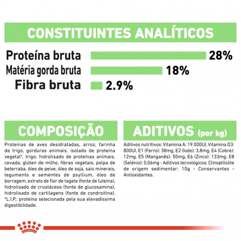 Proteína de carne de aves desidratada, arroz, farinha de trigo, gorduras de origem animal, isolado de proteína vegetal*, trigo, proteínas hidrolisadas de origem animal, cevada, glúten de milho, fibras vegetais, polpa de beterraba, óleo de peixe, óleo de soja, sais minerais, cascas e sementes depsyllium, óleo de borragem, extrato de flôr de tagete (fonte de luteína), crustáceos hidrolisados (fonte de glucosamina), cartilagem hidrolisada (fonte de condroitina).
