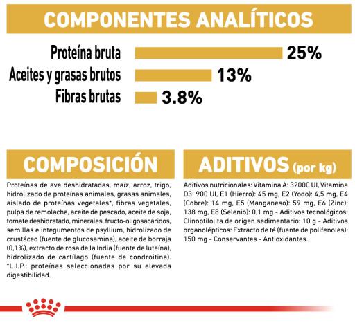 Carne de aves desidratada, arroz, milho, rigo, isolado de proteínas vegetais, gordura animal, hidrolisado de proteínas animais, fibras vegetais, polpa de beterraba, sais minerais, óleo de peixe, óleos vegetais (soja, borragem), tomate (fonte de licopeno), tegumento e sementes de Psyllium, fruto-oligossacarídeos, polifosfato de sódio, taurina, hidrolisado de crustáceos (fonte de glucosamina), L-carnitina, DL-metionina, extracto de flor de tagete (fonte de luteína), extractos de chá verde e de uvas (fontes de polifenóis), hidrolisado de cartilagens (fonte de condroitina).