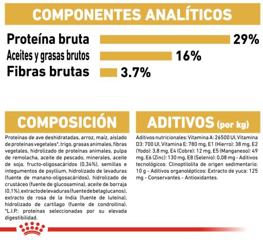 Carne de aves desidratada, arroz, milho, isolado de proteínas vegetais, gordura animal, trigo, fibras vegetais, hidrolisado de proteínas animais, sais minerais, polpa de beterraba, óleo de peixe, óleos vegetais (soja, borragem), fruto-oligossacarídeos, tegumento e sementes de Psyllium, polifosfato de sódio, hidrolisado de leveduras (fonte de mano-oligossacarídeos), taurina, hidrolisado de crustáceos (fonte de glucosamina), extracto de flor de tagete (fonte de luteína), L-carnitina, hidrolisado de cartilagens (fonte de condroitina).