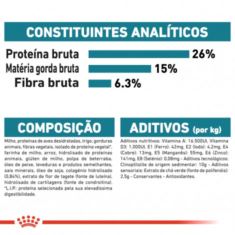 Milho, proteína de carne de aves desidratada, trigo, gorduras de origem animal, fibras vegetais, isolado de proteína vegetal*, farinha de milho, arroz, proteínas hidrolisadas de origem animal, glúten de milho, polpa de beterraba, óleo de peixe, leveduras ou partes das mesmas, sais minerais, óleo de soja, colagénio hidrolisado (0,84%), extrato de flôr de tagete (fonte de luteína), cartilagem hidrolisada (fonte de condroitina).