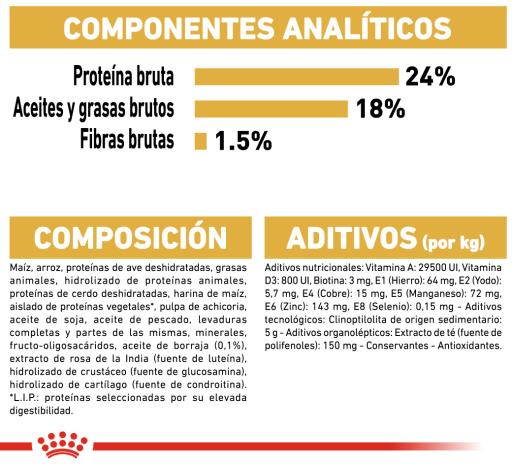 Milho, arroz, gorduras animais, carne de ave desidratada, proteína de porco desidratada, farinha de milho, isolado de proteínas vegetais *, hidrolisado de proteínas animais, polpa de chicória, óleo de soja, minerais, óleo de peixe, leveduras, fructo-oligossacarídeos, óleo de borragem (0.1%), extractos de chá verde e uvas (fonte de polifenóis), hidrolisado de crustáceos (fonte de glucosamina), extracto de Rosa da Índia (fonte de luteína), cartilagem hidrolisada (fonte de condroitina).