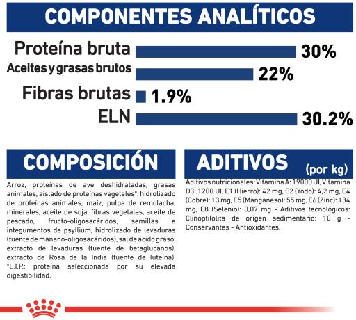 Arroz, carne de aves desidratada, gorduras animais, isolado de proteínas vegetais, hidrolisado de proteínas animais, milho, polpa de beterraba, sais minerais, óleo de soja, fibras vegetais, óleo de peixe, sal de ácido gordo, fruto-oligossacarídeos, tegumento e sementes de Psyllium, hidrolisado de leveduras (fonte de mano-oligossacarídeos e beta-glucanos), ovo desidratado, extracto de Flor de Tagete (fonte de luteína).