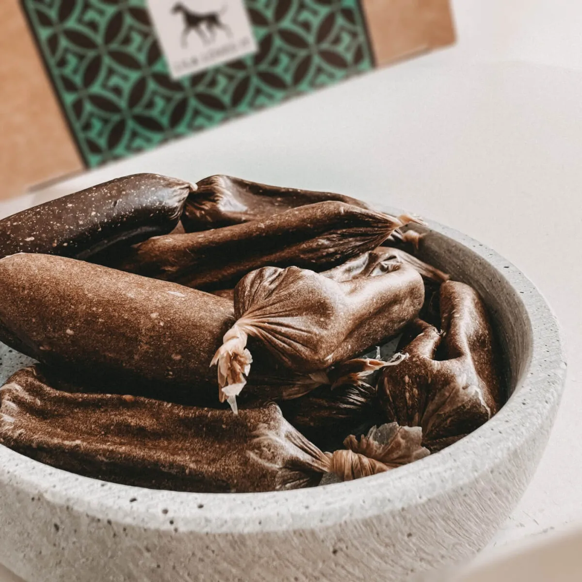 Isso os torna perfeitos como um petisco saudável para cães entre as refeições. A receita das salsichas contém apenas dois ingredientes – 99,8% da melhor carne orgânica dá às salsichas um sabor irresistível e uma pequena pitada de sal marinho garante que as salsichas se mantenham por muito tempo de forma completamente natural. Não contêm aditivos artificiais, realçadores de sabor ou conservantes, tornando-os perfeitos para cães com alergias ou sensibilidades alimentares.