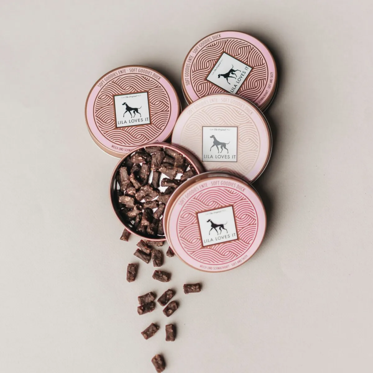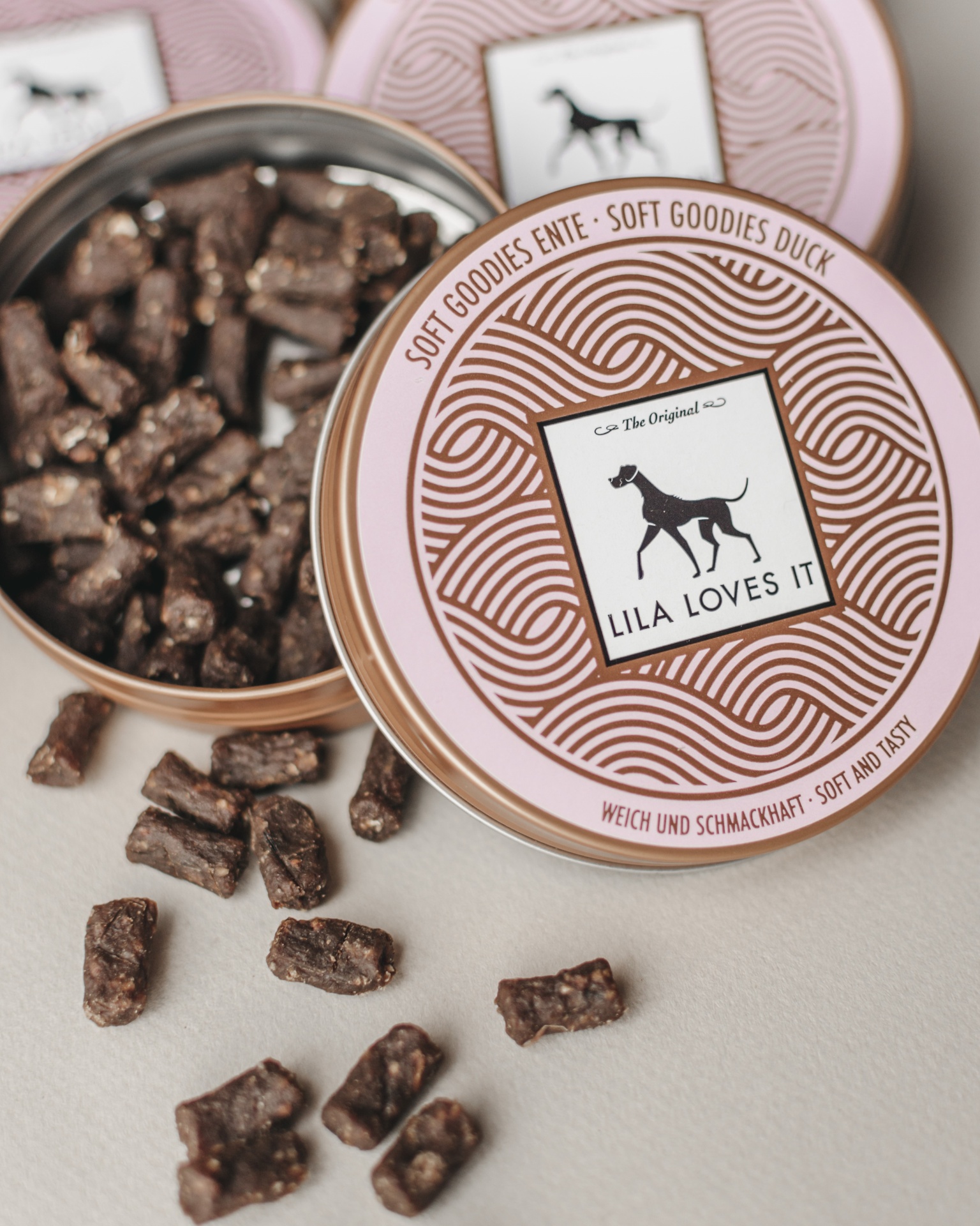 Os SOFT GOODIES DUCK são guloseimas saudáveis feitas de carne de pato. As guloseimas Soft Dog são o petisco de treino perfeitos para filhotes, de raças cães pequenos e de cães mais velhos com problemas dentários. Para garantir a digestibilidade das guloseimas de pato, a receita é deliberadamente minimalista e reduzida ao essencial, como acontece com todos os biscoitos de cão da LILA LOVES IT: carne de pato pura, glicerina vegetal, linhaça, sal marinho, fibra de maçã, morango e cúrcuma.
