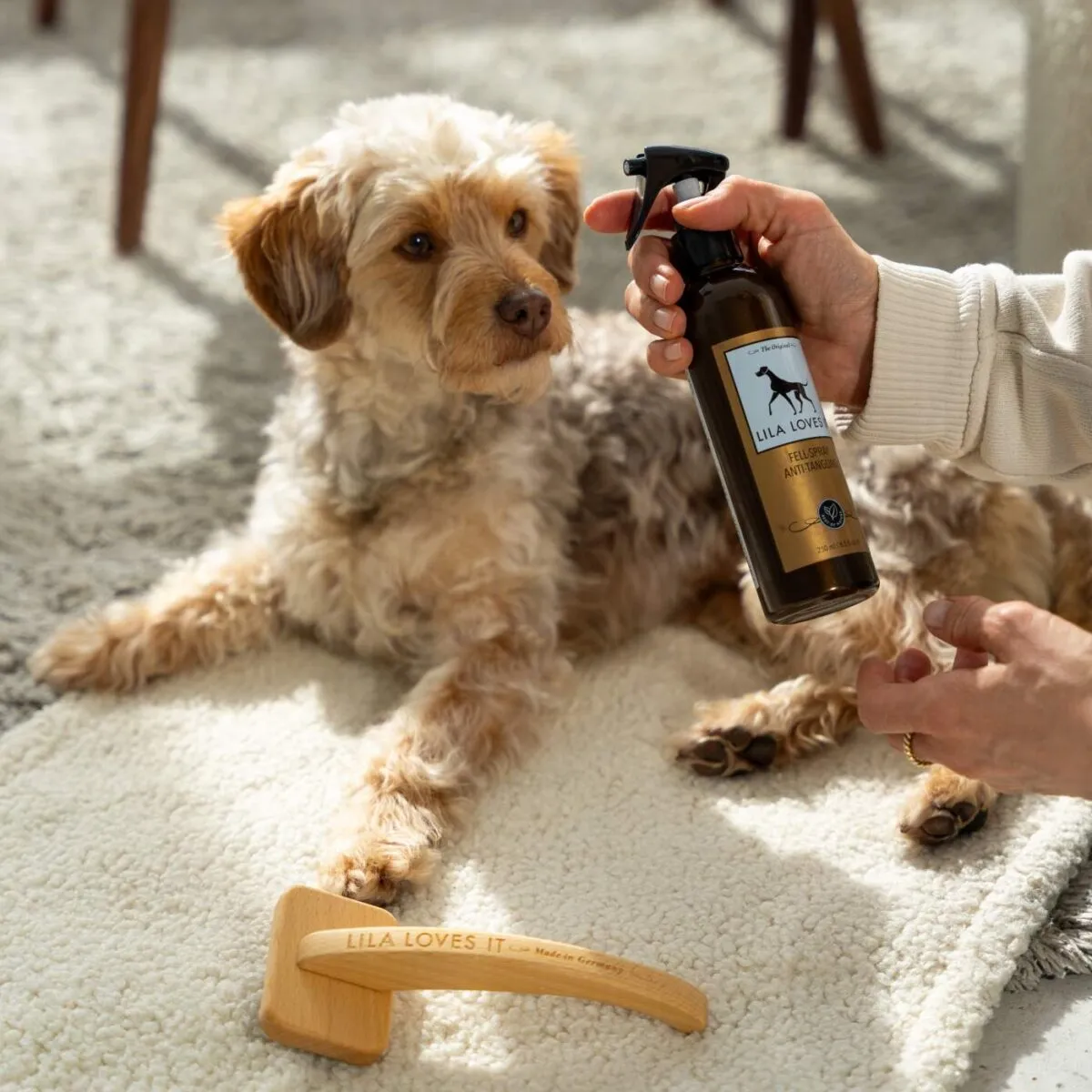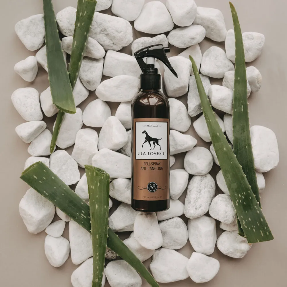 Graças ao Spray Desembaraçante, o pentear do seu cão torna-se um agradável ritual de relaxamento. A sua composição inteligente optimiza a penteabilidade, repondo a pelagem quebradiça, alisando os cabelos crespos e nutrindo a pele seca. A Aloe Vera proporciona hidratação revitalizante, o óleo de Jojoba ajuda a pele e cabelo a reter a humidade, o óleo de coco é rapidamente absorvido, domando e nutrindo o cabelo sem pesá-lo e o precioso óleo de Noz de Macadâmia assemelha-se ao próprio sebo da pele. Este spray deixa os cabelos macios realçando o seu brilho natural. Com um suave e dog-friendly aroma de óleo essencial de lavanda cria uma atmosfera de relaxamento para o seu cão.